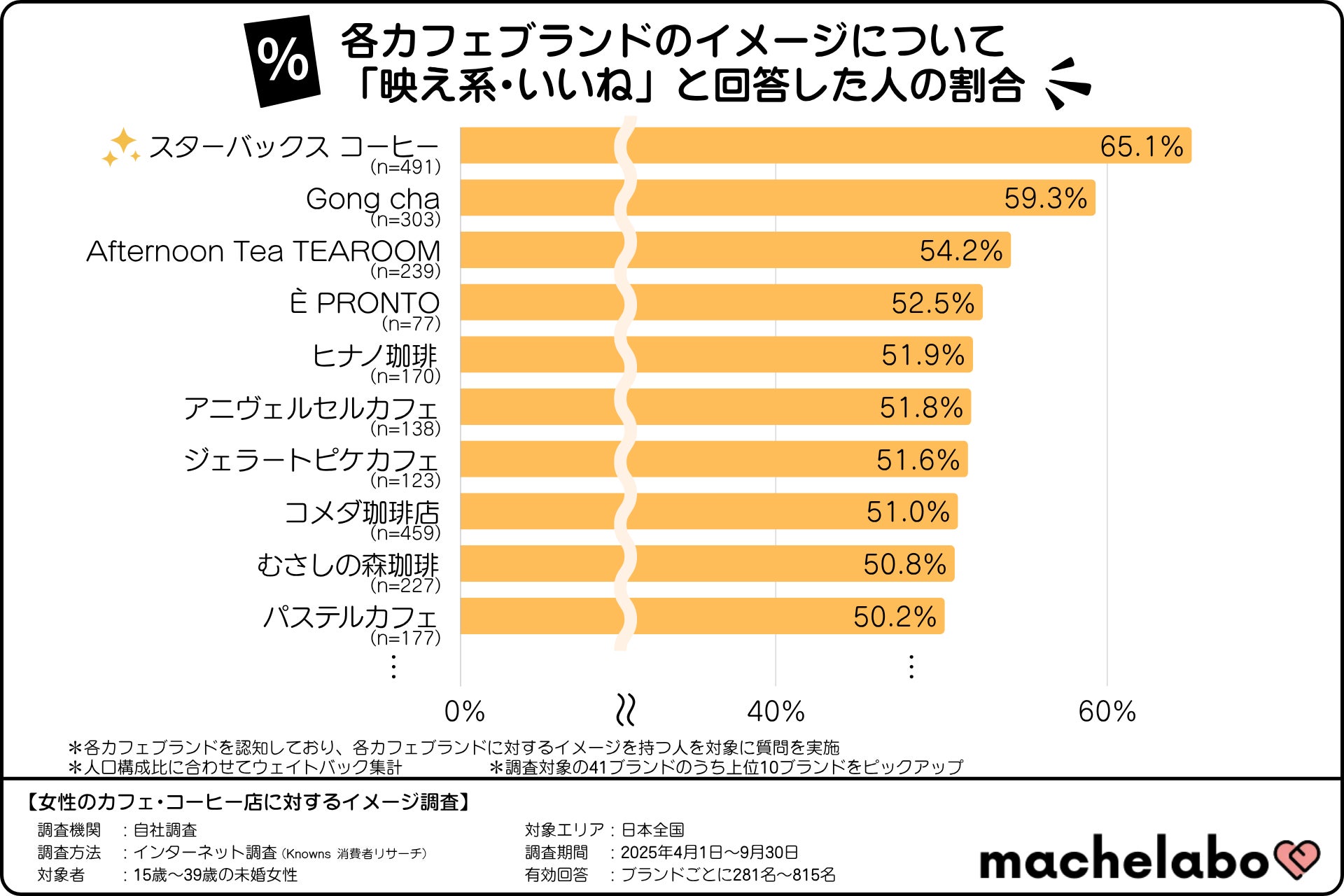 「映え系・いいね」に当てはまると回答した割合が最も高かったのは『スターバックス』(65.1%)で、写真に撮りたくなるような魅力を持つ場所として認識されていることがうかがえます。2位は『Gong cha』の59.3%、3位は『Afternoon Tea TEAROOM』の54.2%、4位は『È PRONTO』の52.5%と続きました。