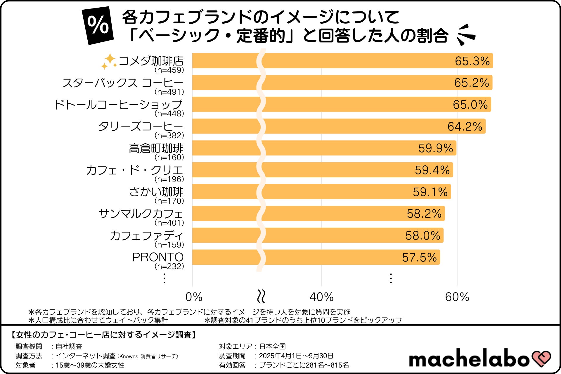 「ベーシック・定番的」に当てはまると回答した割合が最も高かったのは『コメダ珈琲店』(65.3%)でした。ただし、2位の『スターバックス』が65.2%、3位の『ドトールコーヒーショップ』が65.0%、4位の『タリーズコーヒー』が64.2%と、上位4ブランドが1ポイント強の範囲に集中しており、いずれも「定番」として女性に認識されていることがうかがえます。