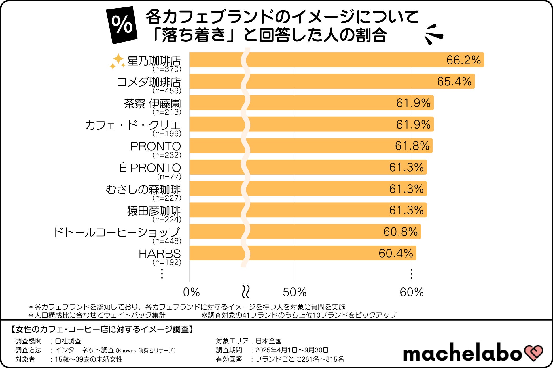 「落ち着き」に当てはまると回答した割合が最も高かったのは『星乃珈琲店』(66.2%)で、落ち着いて会話ができる場所というイメージを持つ人が多いようです。2位は『コメダ珈琲店』の65.4%と僅差で続き、3位は『カフェ・ド・クリエ』と『茶寮 伊藤園』が61.9%で同率で並びました。