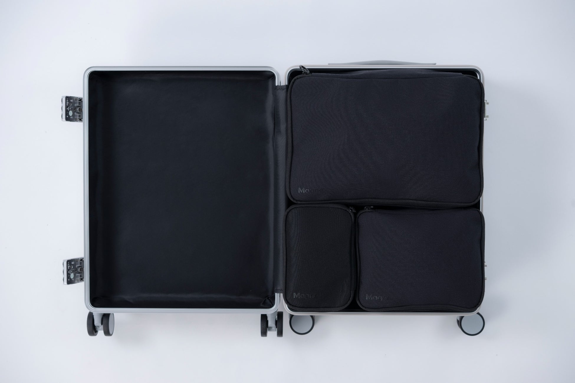「Magne Suitcase」は、ボディ全⾯にマグネシウム合⾦を採⽤した世界初のスーツケースであり、重量わずか2.9kgという世界最軽量の⾦属スーツケースです。従来はトレードオフとされていた「軽さ」と「耐久性」を、⾼精度な素材加⼯技術と設計により両⽴。移動時の負担を軽減しながら、壊れにくく⻑く使える構造を実現しています。外装には上品なシルバーを採⽤し、ミニマルな佇まいと所有感を両⽴。内部は⽚開き仕様で、必要⼗分な収納性を保ちながら軽量化を図っています。キャスターには、柔軟性と耐久性に優れたエラストマー素材を採用。空港やホテルなど静かなフロアでも、ほとんど音を立てずにスムーズに動きます。