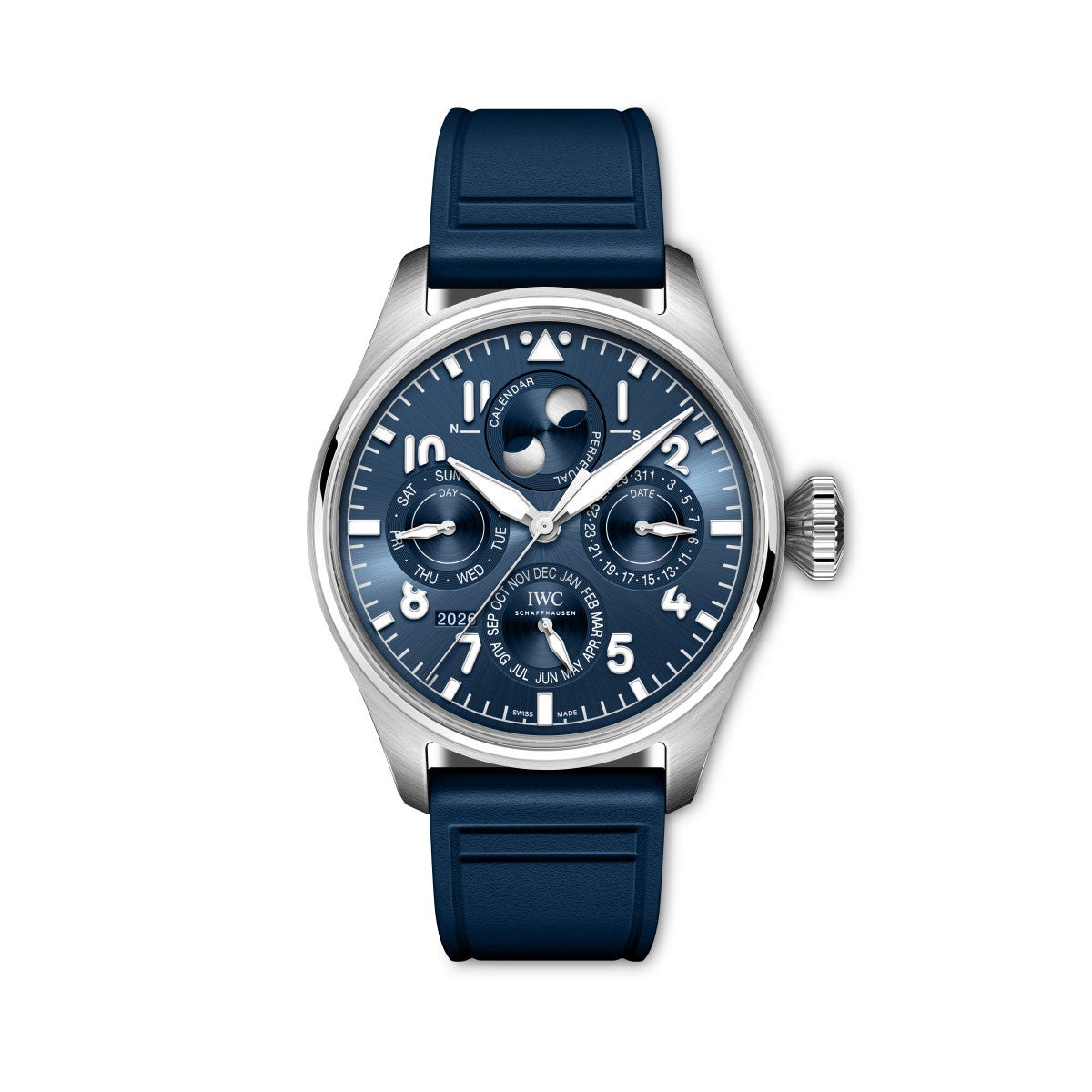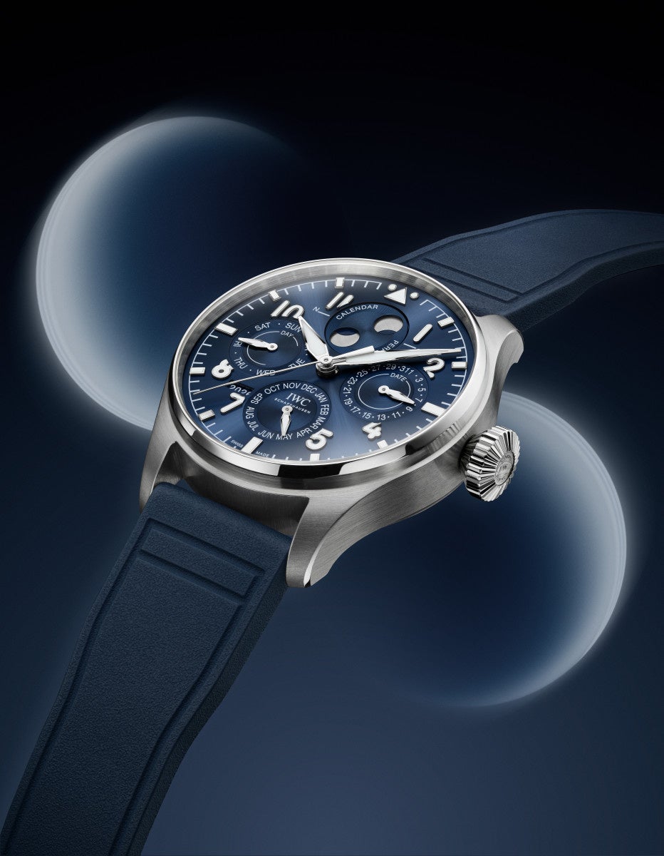 . 「ビッグ・パイロット・ウォッチ・パーペチュアル・カレン ダー・プロセット“プティ・プランス”」(Ref. IW339601) は、直径43 mm、ホワイトの酸化ジルコニウム・セラミッ ク製ケースと、グラデーション仕上げが施されたディー プブルーの文字盤を備えています。文字盤の数字とインデックスはホワイトでプリントが施され、ロジウムメッキの針にはスーパールミノバがコーティングされています。 この時計に組み合わされるのは、EasX-CHANGEシステ ムを装備したホワイトのラバー・ストラップです。