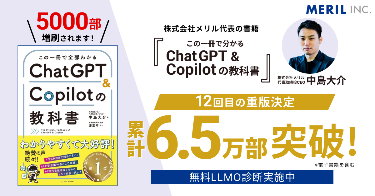 株式会社メリル(本社:静岡県静岡市葵区、代表取締役:中島大介、以下「メリル」)の代表が執筆した書籍「この一冊で全部わかる ChatGPT & Copilotの教科書」(SBクリエイティブ刊)の重版5000部が決定いたしました。今回の重版により、電子書籍を含む累計刷部数が6.5万部を突破し、13刷目の発行となります。