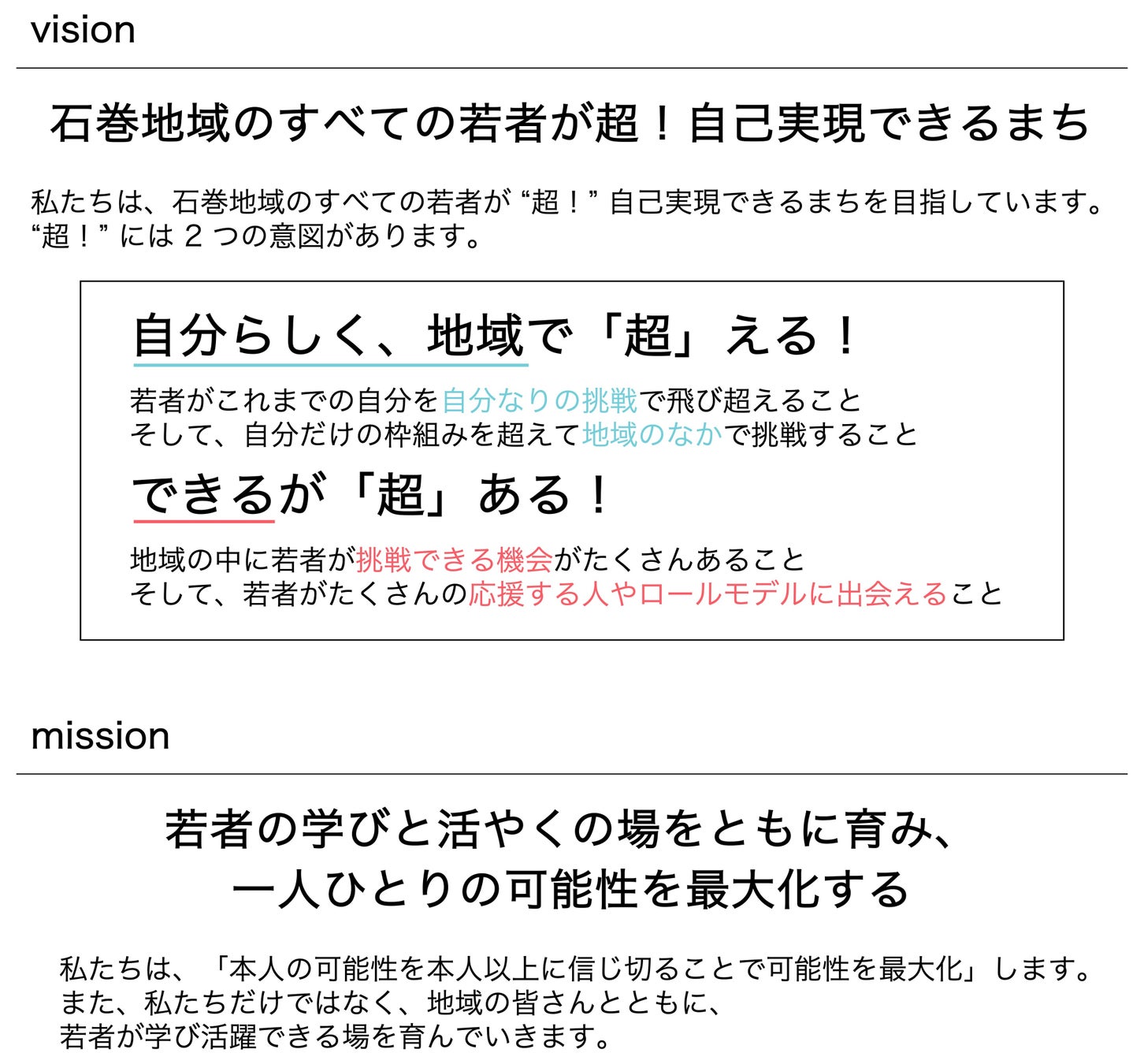「石巻地域のすべての若者が超!自己実現できるまちへ」をビジョンに掲げ、学校・行政・地域と連携しながら、高校生を中心とした若者の様々なチャレンジや成長をサポートする活動を行っています。