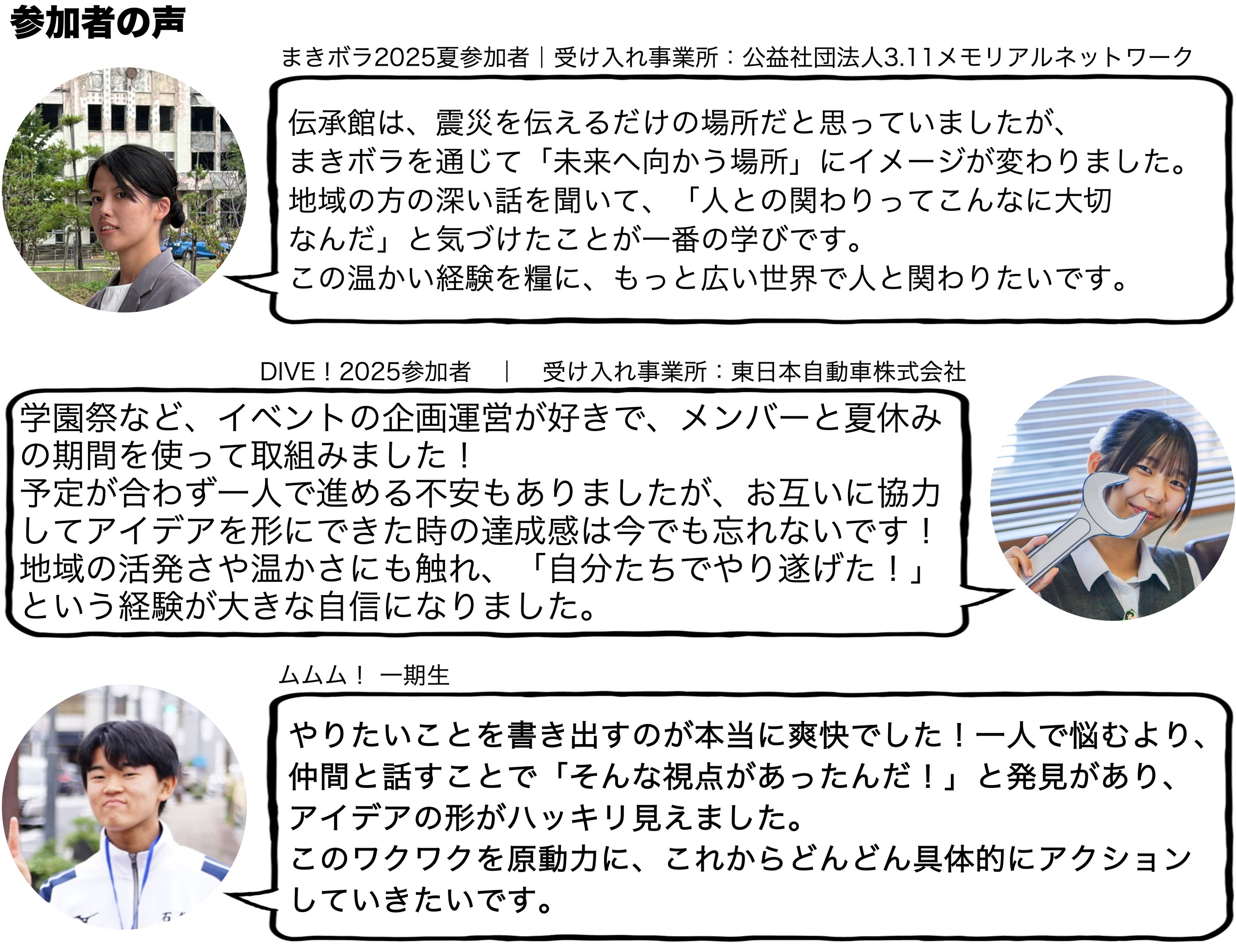 ▼まちと人とに関わる高校生、受け入れ事業所の方々の声
