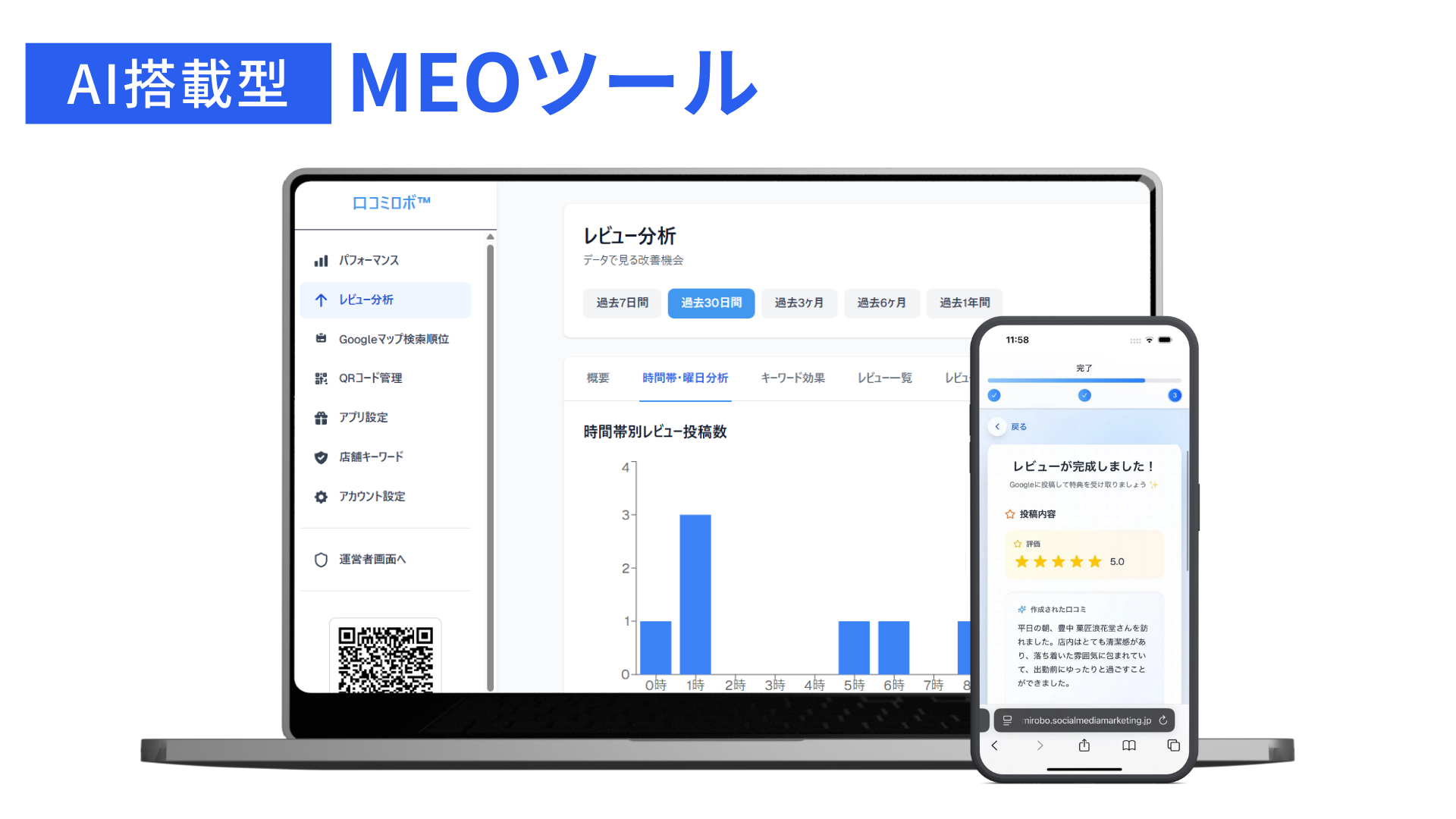製品概要:QRコードを読み取り、簡単なアンケートに答えるだけで、AIが質の高い口コミ文章を自動生成するSaaSツール。ITが苦手な店舗事業者様でも、専門知識不要で口コミマーケティングを実践できます。