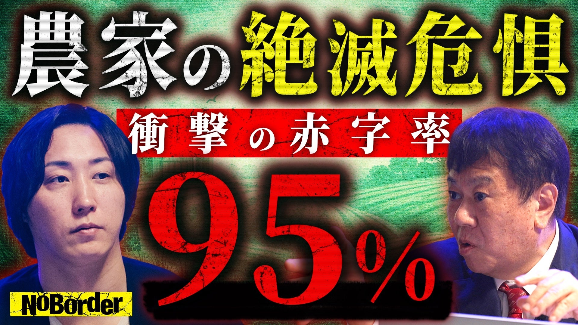 地上波タブーのニューメディア『NoBorder』を展開する株式会社NoBorder(本社:東京都港区、代表取締役:溝口勇児)は、「#43 農家の赤字率95%の脅威─補助金依存と後継者不足で壊れた“食料自給不足”という国家の大失敗」を本日21:00に公開したことをお知らせいたします。