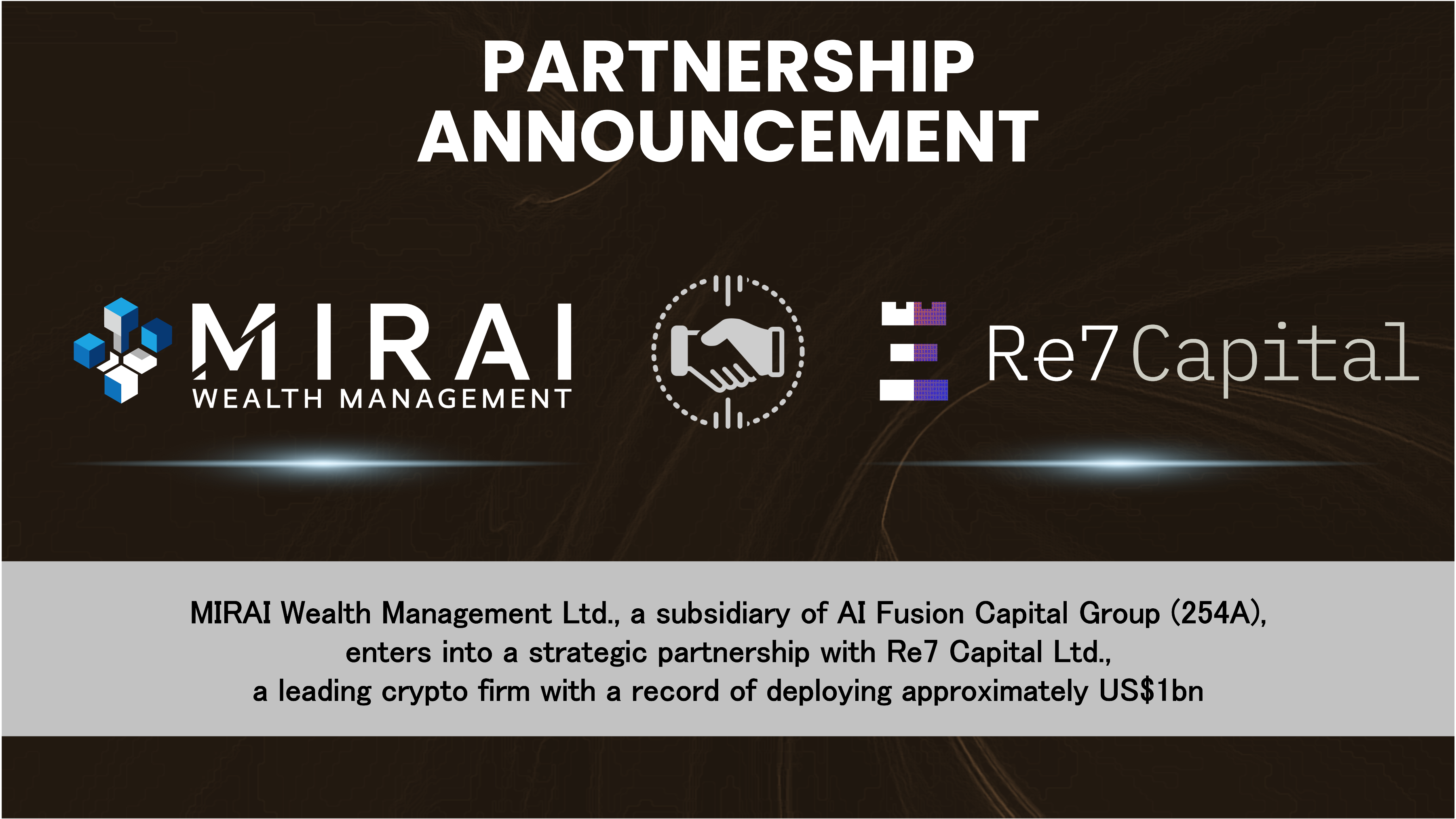 MIRAI Wealth Management Co., Ltd. (hereinafter “MWM”), a subsidiary of AI Fusion Capital Group Corp., is pleased to announce that it has entered into a strategic partnership (hereinafter the “Partnership”) with Re7 Capital Ltd (hereinafter “Re7”), one of the world’s leading crypto asset investment firms with a track record of deploying approximately $1 billion USD for institutional investors and high-net-worth individuals globally.