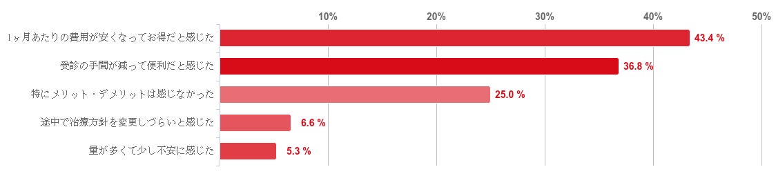 「1ヶ月あたりの費用が安くなってお得だと感じた」と回答した人が43.4%と回答者の4割を占め最も多く、次に「受診の手間が減って便利だと感じた」との回答が36.8%となり、回答者の約8割がレバクリの「定期配送・おまとめ処方」にメリットを感じていることがわかった。