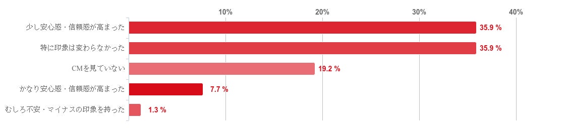 「少し安心感・信頼感が高まった」と「特に印象は変わらなかった」と回答した人が共に35.9%で最も多く、「かなり安心感・信頼感が高まった」との回答も僅かにみられた。反対に、「むしろ不安・マイナスの印象を持った」と回答した人はほとんどいなかった。