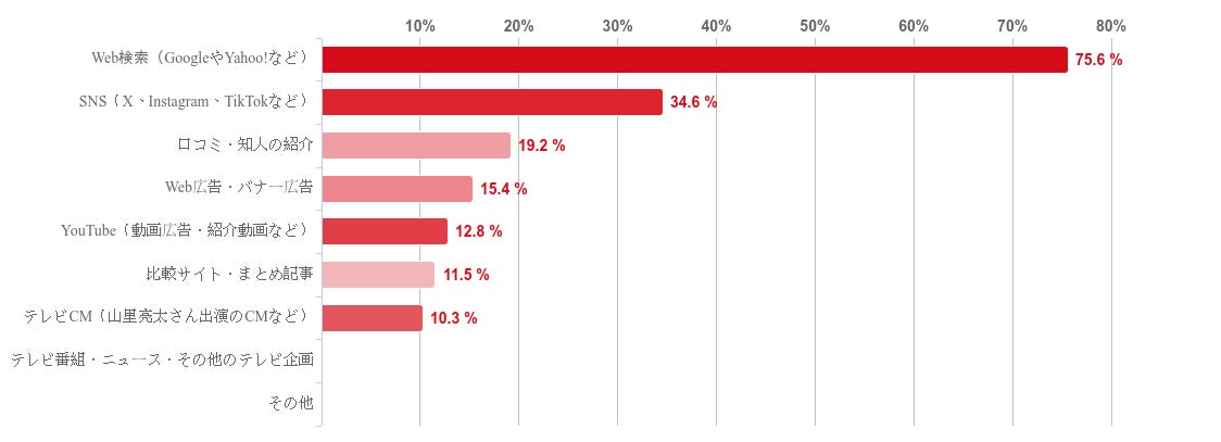 「Web検索(GoogleやYahoo!など)」と回答した人が75.6%で圧倒的に多く、次いで「SNS(X、Instagram、TikTokなど)」(34.6%)、「口コミ・知人の紹介」(19.2%)という順で並んだ。