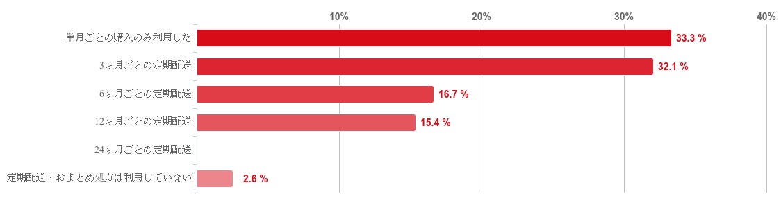 「単月ごとの購入のみ利用した」と回答した人が33.3%で最も多く、次いで「3ヶ月ごとの定期配送」との回答が32.1%と僅差で続いた。また、「6ヶ月ごとの定期配送」と回答した人が16.7%、「12ヶ月ごとの定期配送」との回答が15.4%と続いた。
