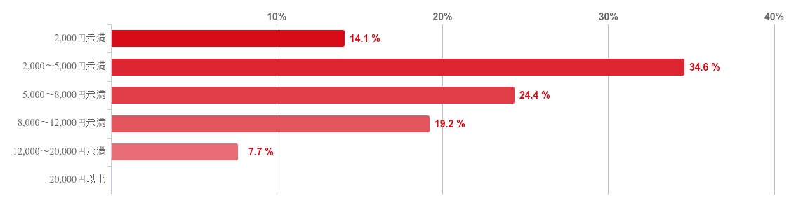 「2,000〜5,000円未満」と回答した人が34.6%で最も多く、次いで「5,000〜8,000円未満」との回答が24.4%で続き、回答者の約6割の人の1ヶ月あたりの負担額が「2,000〜8,000円未満」だということがわかった。そのほか、「8,000〜12,000円未満」と回答した人が19.2%、「2,000円未満」との回答が%と14.1%で続いた。