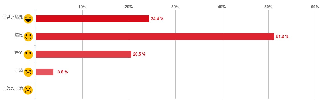 「満足」と回答した人が51.3%となり、約7割で最も多く、「非常に満足」(24.4%)との回答と合わせると約8割の人が満足していることがわかった。反対に、「不満」と回答した人は3.8%と僅かで「非常に不満」と回答した人はいなかった。