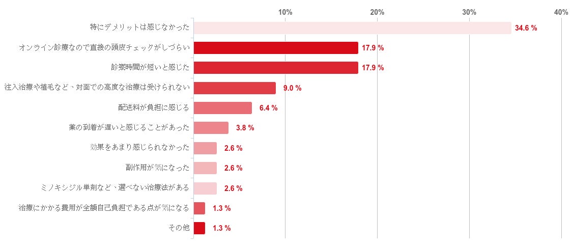 「特にデメリットは感じなかった」と回答した人が34.6%で最も多かった。なお、デメリットとしてあがった回答として「オンライン診療なので直接の頭皮チェックがしづらい」と「診察時間が短いと感じた」が共に17.9%で最も多かった。