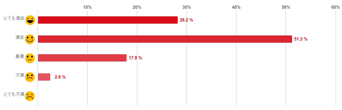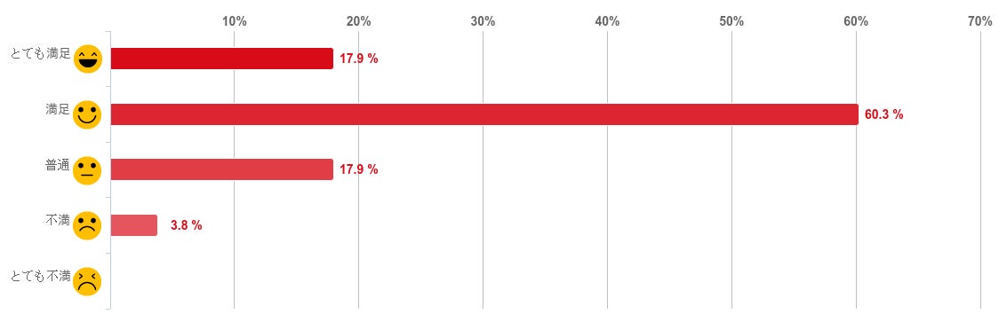 「満足」と回答した人が59.0%で約6割となり最も多く、「とても満足」との回答と合わせると8割以上の人が満足していることがわかった。反対に、「不満」と回答した人は1.3%と僅かで、「とても不満」と回答した人はいなかった。