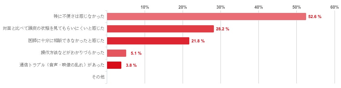 「特に不便さは感じなかった」と回答した人が52.6%で最も多かったが、そのほか、「対面と比べて頭皮の状態を見てもらいにくいと感じた」との回答が28.2%、「医師に十分に相談できなかったと感じた」が21.8%と一定数みられた。