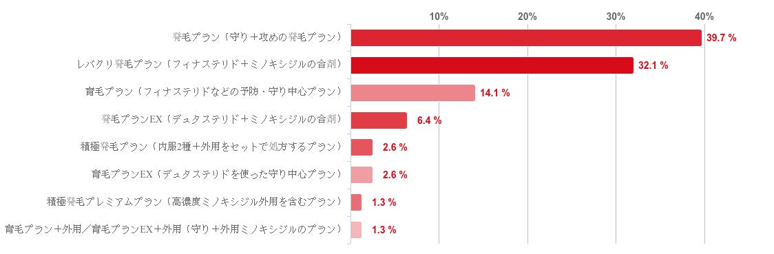 「発毛プラン(守り+攻めの発毛プラン)」と回答した人が39.7%で最も多く、次いで「レバクリ発毛プラン(フィナステリド+ミノキシジルの合剤)」との回答が32.1%と共に3割以上を占めた。そのほか、「育毛プラン(フィナステリドなどの予防・守り中心プラン)」も14.1%と一定数の回答を得た。