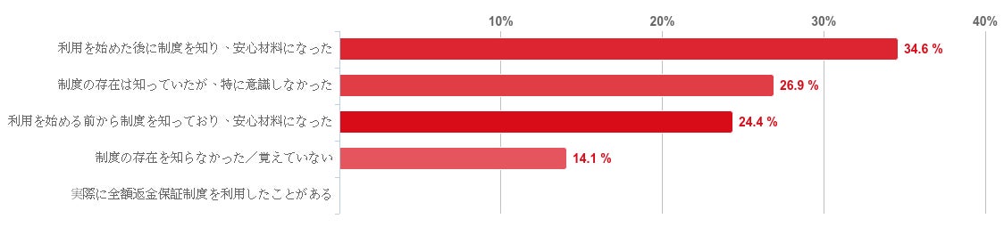 「利用を始めた後に制度を知り、安心材料になった」と回答した人が34.6%で最も多く、次に「制度の存在は知っていたが、特に意識しなかった」との回答が26.9%、「利用を始める前から制度を知っており、安心材料になった」」との回答が24.4%となり、制度の存在を知っていた人が8割以上とレバクリの「全額返金保証制度」の認知度が高いことがわかった。