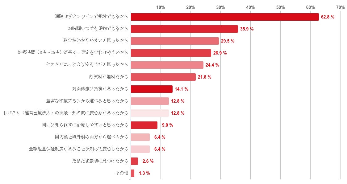 「通院せずオンラインで受診できるから」と回答した人が62.8%で最も多く、次いで、「24時間いつでも予約できるから」(35.9%)、「料金がわかりやすいと思ったから」(29.5%)、「診察時間(8時〜26時)が長く、予定を合わせやすいから」(26.9%)という順で並んだ。