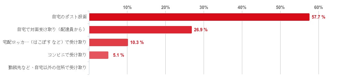 「自宅のポスト投函」と回答した人が57.7%で圧倒的に多く、回答者の約6割がレバクリのAGA治療薬を自宅へのポスト投函で受け取っていた。続いて、「自宅で対面受け取り(配達員から)」(26.9%)、「宅配ロッカー(はこぽす など)で受け取り」(10.3%)、「コンビニで受け取り」(5.1%)という順となった。