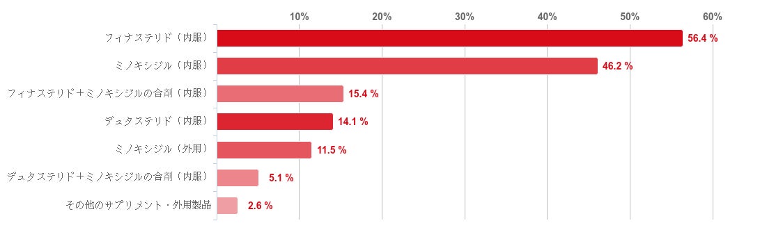 「フィナステリド(内服)」と回答した人が56.4%で最も多く、次いで「ミノキシジル(内服)」との回答が46.2%と続き、この二つの回答が多くの割合を占めた。そのほか、「フィナステリド+ミノキシジルの合剤(内服)」が15.4%、「デュタステリド(内服)」が14.1%と少数の回答を得た。