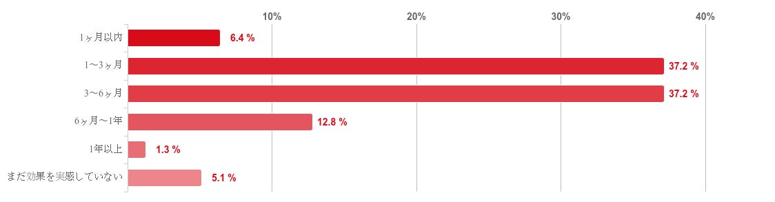 「1〜3ヶ月」、「3〜6ヶ月」と回答した人が共に37.2%で最も多く、回答者の7割以上が「1〜6ヶ月」で治療の効果を実感し始めていることがわかった。また、「6ヶ月〜1年」との回答が12.8%で続き、「1年以上」と回答した人は1.3%と僅かだった。