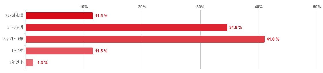 「6ヶ月〜1年」と回答した人が41.0%で最も多く、次に「3〜6ヶ月」との回答が34.6%で回答者の7割以上の治療期間が「3か月~1年未満」ということがわかった。