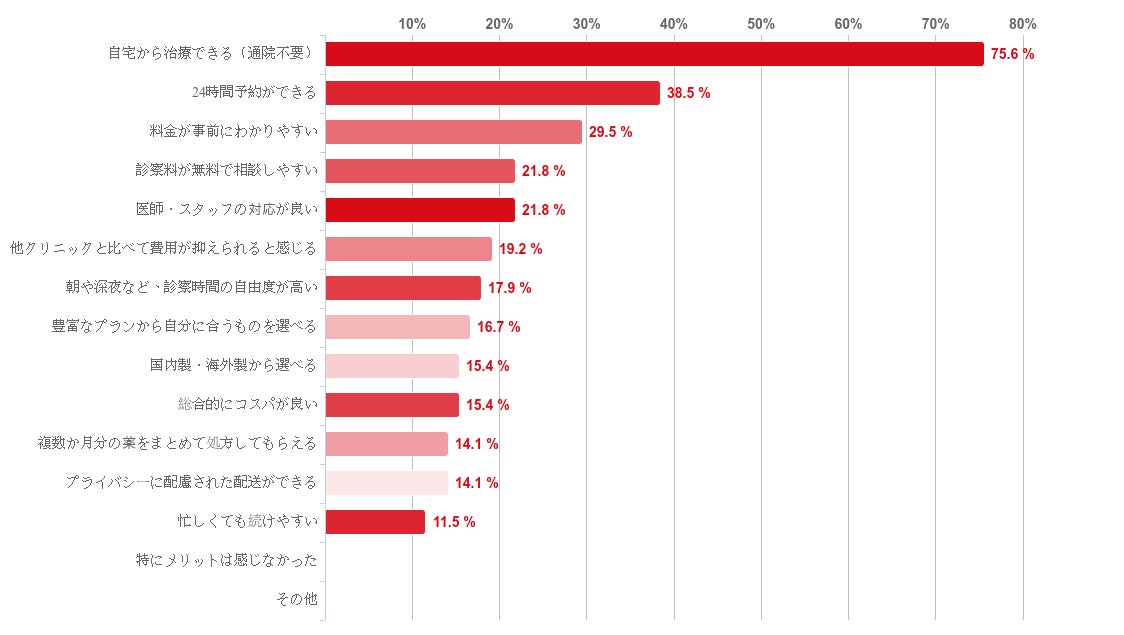 「自宅から治療できる(通院不要)」との回答が75.6%で最も多く、次に「24時間予約できる」との回答が38.5%となった。そのほか、「診察料が無料で相談しやすい」「医師・スタッフの対応が良い」「他クリニックと比べて費用が抑えられると感じる」「朝や深夜など、診察時間の自由度が高い」との回答もそれぞれ約2割集まった。