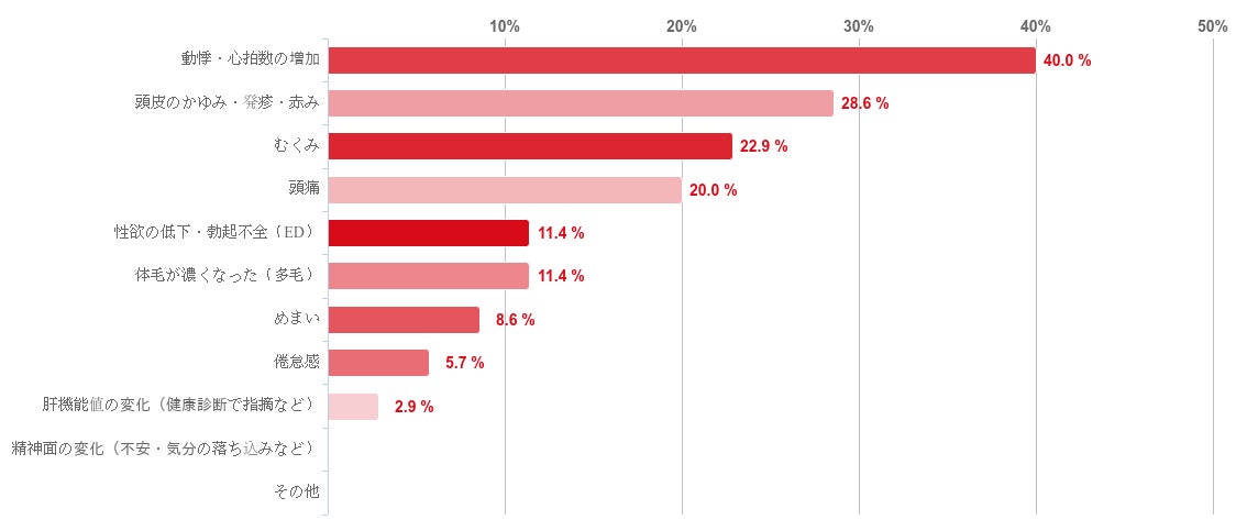 「動悸・心拍数の増加」との回答が共に40.0%で最も多く、次いで「頭皮のかゆみ・発疹・赤み」との回答が28.6%、「むくみ」との回答が22.9%となった。そのほか、「頭痛」、「性欲の低下・勃起不全(ED)」、「体毛が濃くなった(多毛)」などの回答も少数みられた。