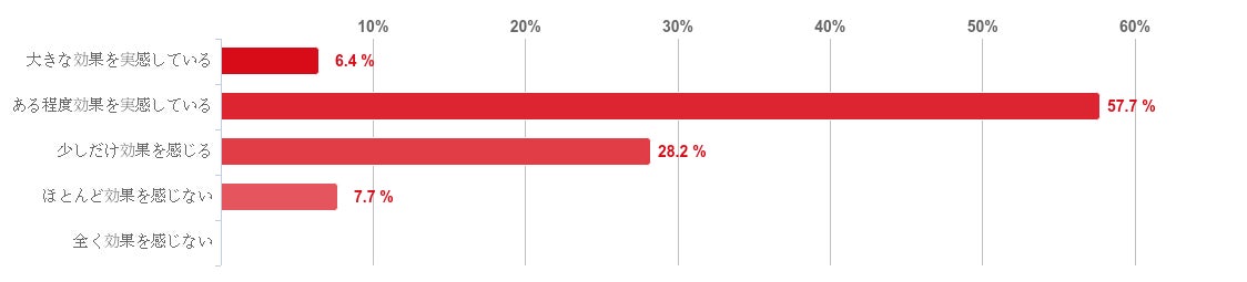 「ある程度効果を実感している」と回答した人が57.7%で最も多く、次に「少しだけ効果を感じる」との回答が28.2%、「大きな効果を実感している」が6.4%で、回答者の9割以上が治療の効果を実感していることがわかった。反対に、「ほとんど効果を感じない」との回答が7.7%、「全く効果を感じない」との回答はみられなかった。