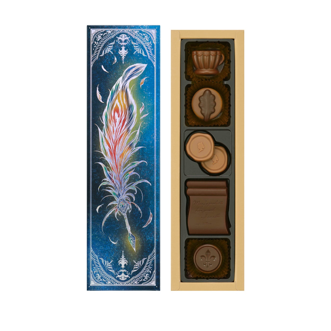虹色の羽ペンが描かれた箱に、コーヒーや紅茶のチョコレートを詰め合わせました。