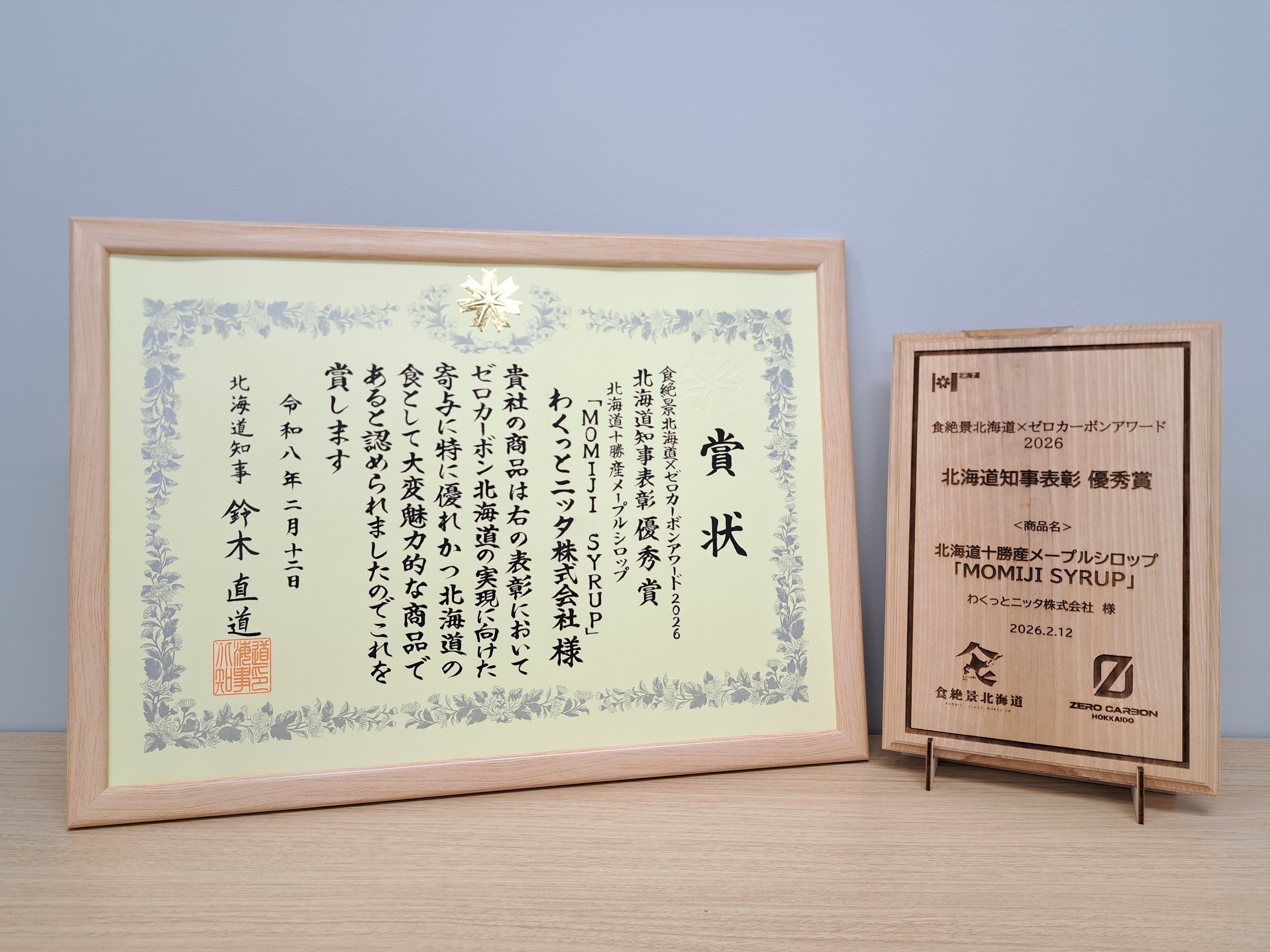 ニッタ株式会社(大阪府大阪市、代表取締役社長 北村精一)のグループ会社、わくっとニッタ株式会社の国産メープルシロップ「MOMIJI SYRUP」が、北海道が主催する「食絶景北海道×ゼロカーボンアワード2026」において、優秀賞を受賞しました。
