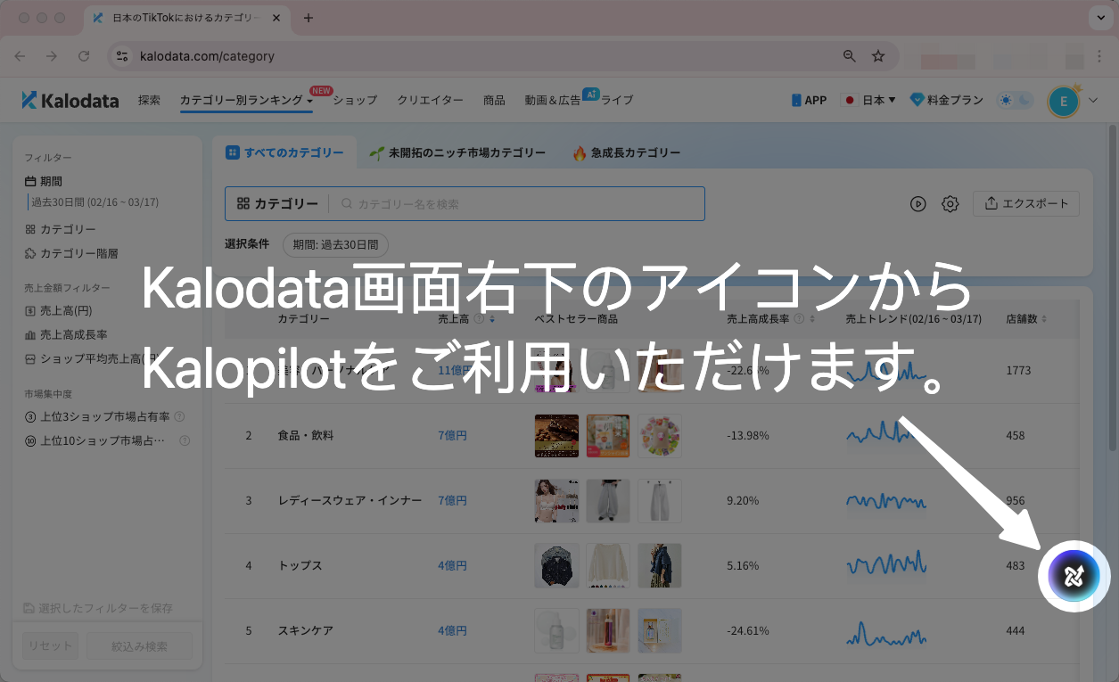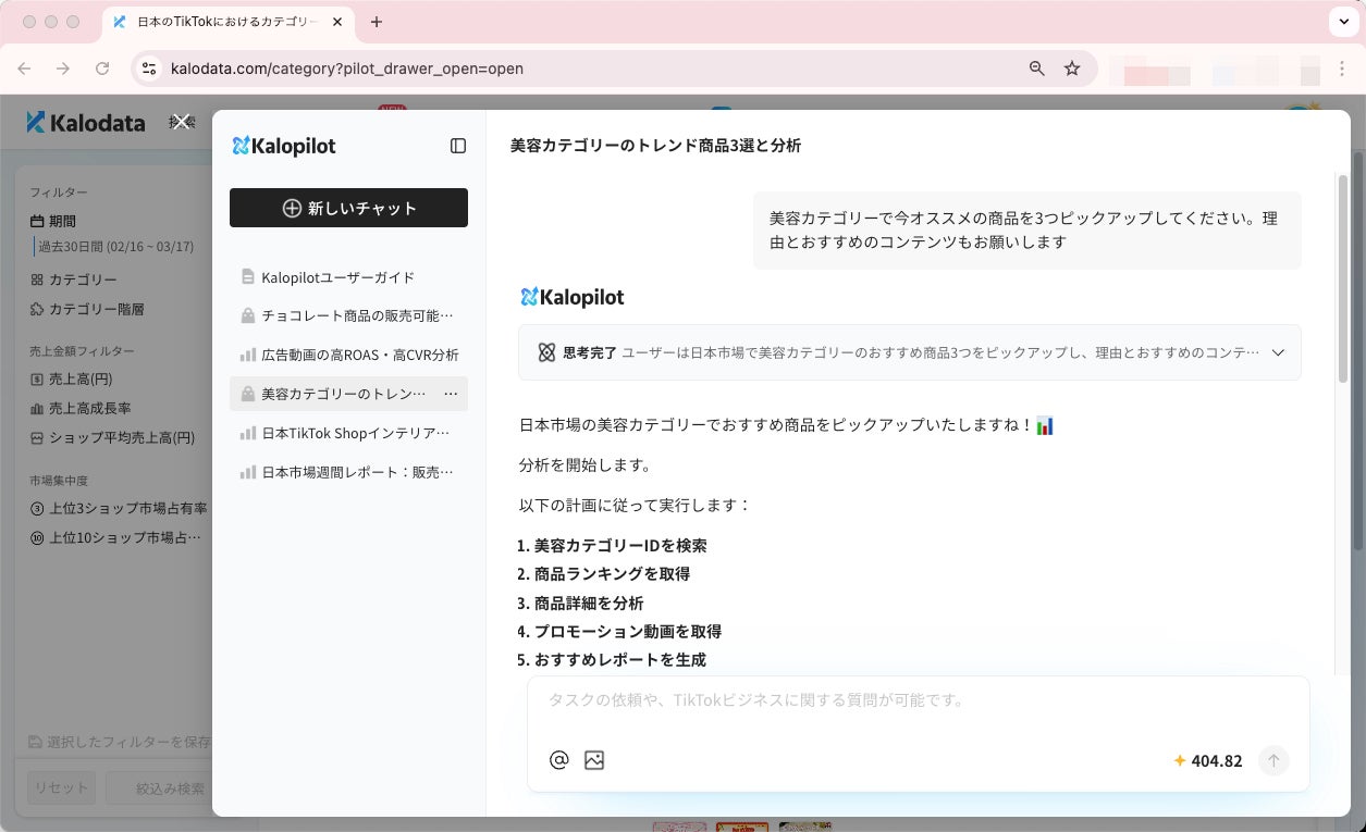 Kalopilotは、TikTok Shopデータの分析や市場調査を支援するAIアシスタントです。