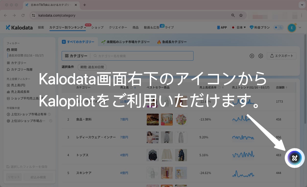 Kalodataでは、TikTok Shop日本市場に関する詳細データの閲覧、