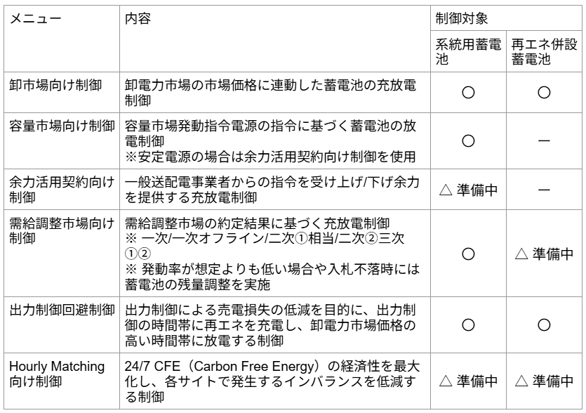 Shizen Connectは、以前より「Shizen Connect」を活用して、系統用及び産業用蓄電池を含む幅広いエネルギーリソースの制御・監視を行ってきました。複数の系統用蓄電池案件の運用代行(*3、*4、*5)及びSaaS(Software as a Service)提供(*6)の実績があり、「マルチパーパス」で卸市場向け制御、需給市場の各商品向け制御、容量市場発動指令電源向け制御をはじめとした幅広い制御を提供することが可能です(表1)。また、「ベンダーフリー」でメーカーを問わず多様な蓄電池やローカルEMSとの連携を積極的に行っています。