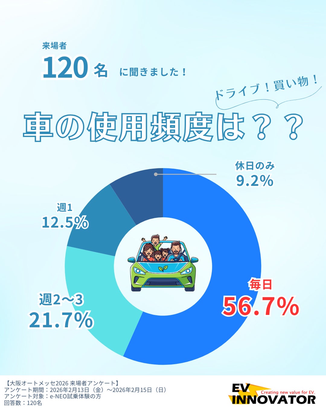 EV INNOVATOR(イーブイ イノベーター)(運営:スカイ・イノベーター株式会社/本社:東京都渋谷区、代表取締役:三浦 武郎)は、2026年2月にインテックス大阪で開催された西日本最大級の自動車イベント「大阪オートメッセ2026」内にて、体験試乗者を対象にしてアンケート調査を実施いたしました。
