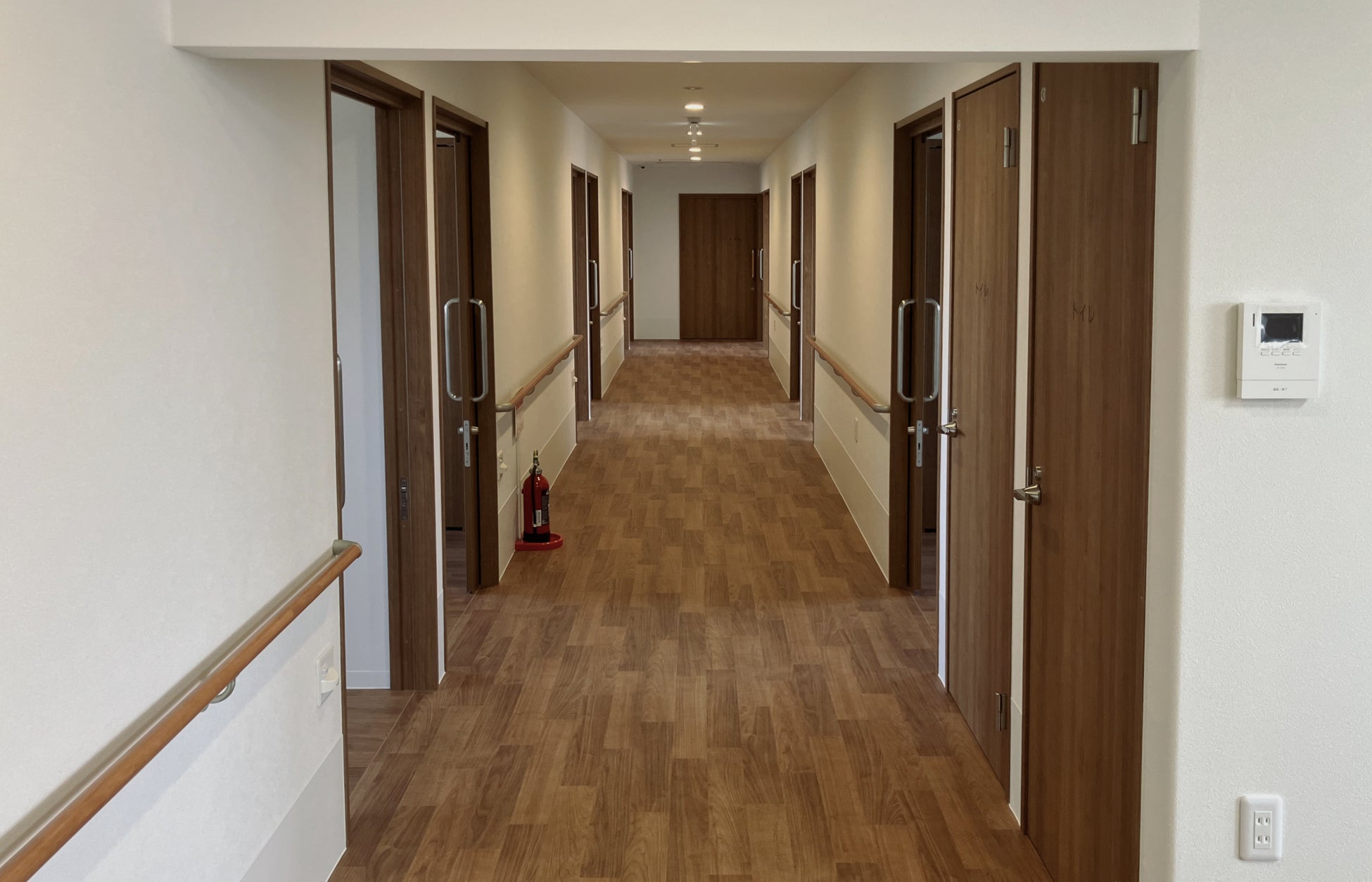 また、建物はグループホーム開設のために新築し、バリアフリートイレと入浴リフト、玄関スロープやエレベーターの設置など、バリアフリーに対応しているため、車いすの方も生活できます。防犯カメラやスプリンクラーなど、防犯・防災設備も備えています。