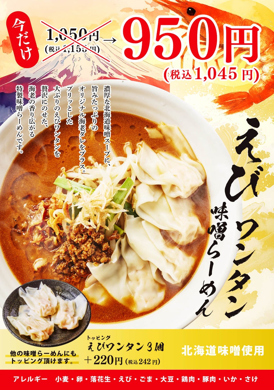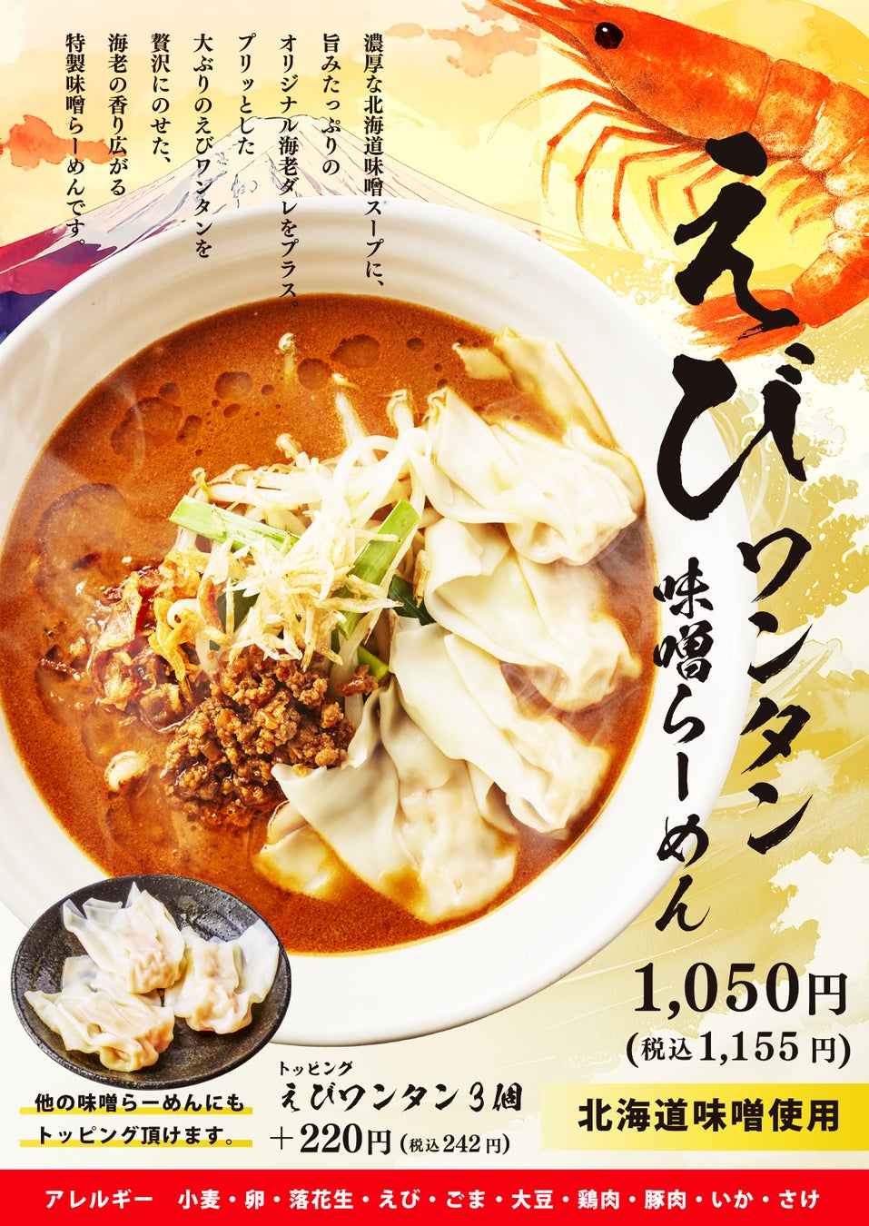 濃厚北海道味噌に エビのうま味を重ねた新作 北海道味噌使用「えびワンタン味噌らーめん」