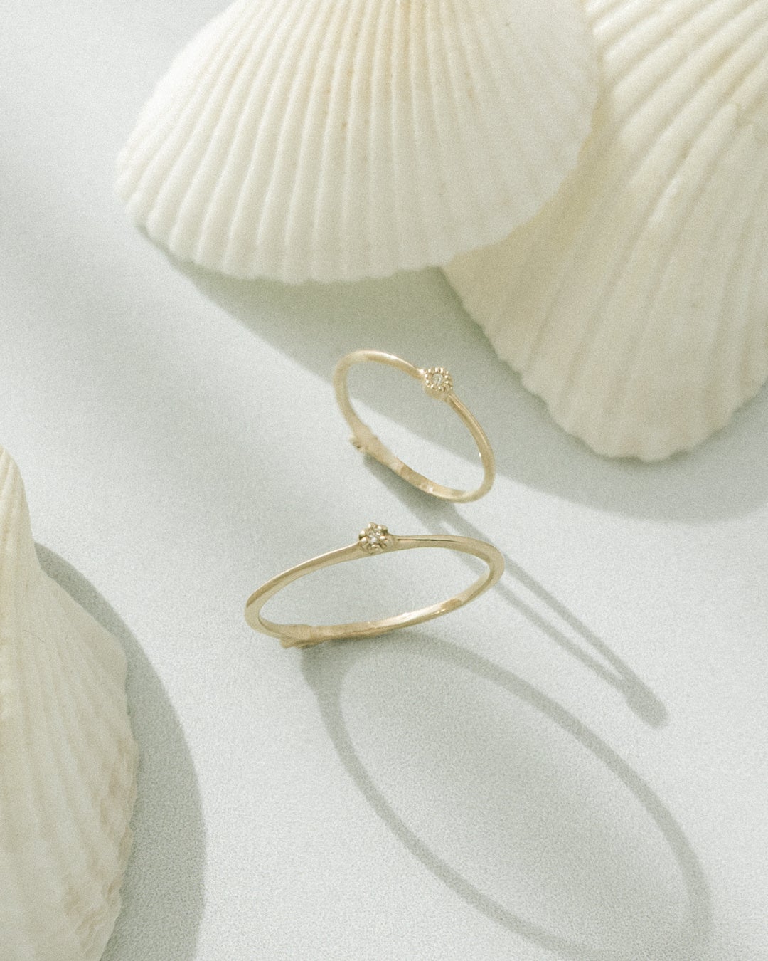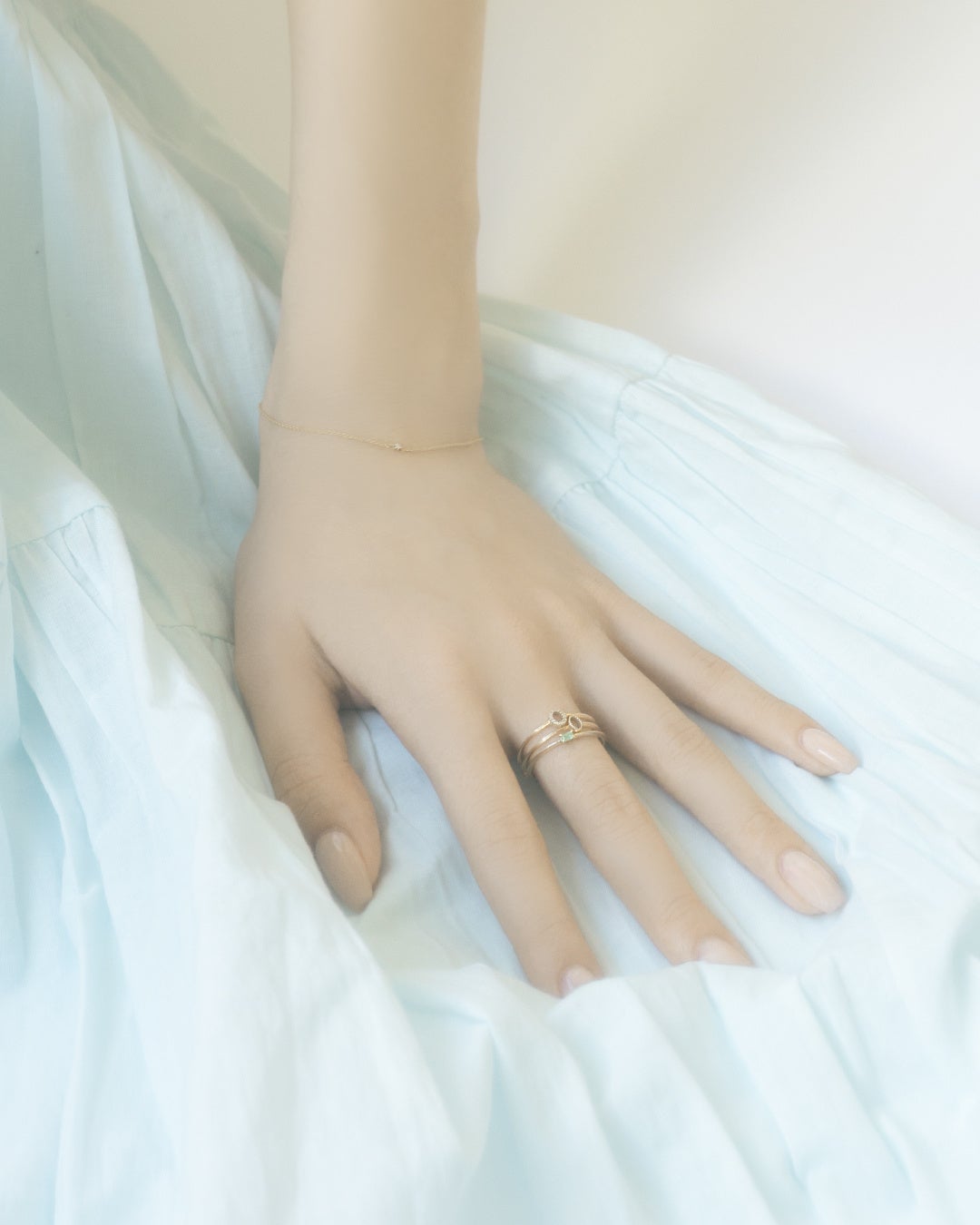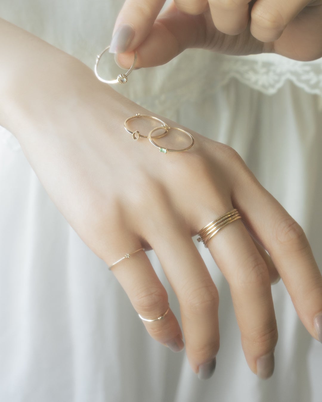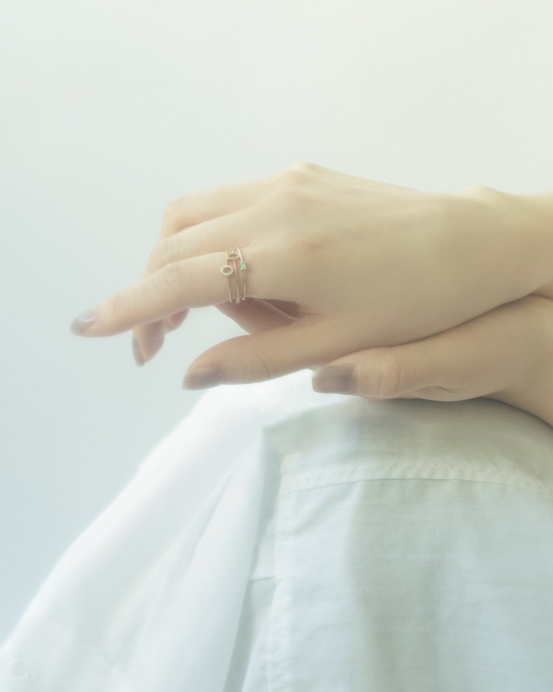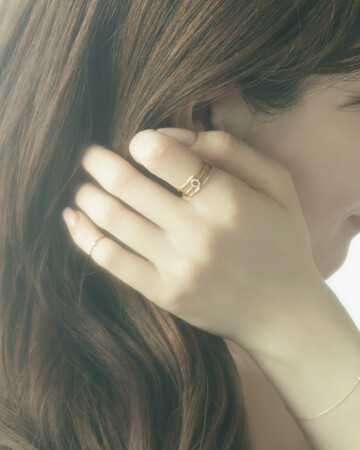 K18素材をメインに展開する〈e.m.gold〉からは、フラットで洗練されたシルエットのリングが登場。レイヤードスタイルで、デザインの魅力を存分に引き立てるコーディネートがおすすめです。