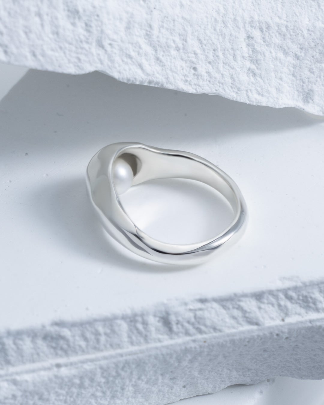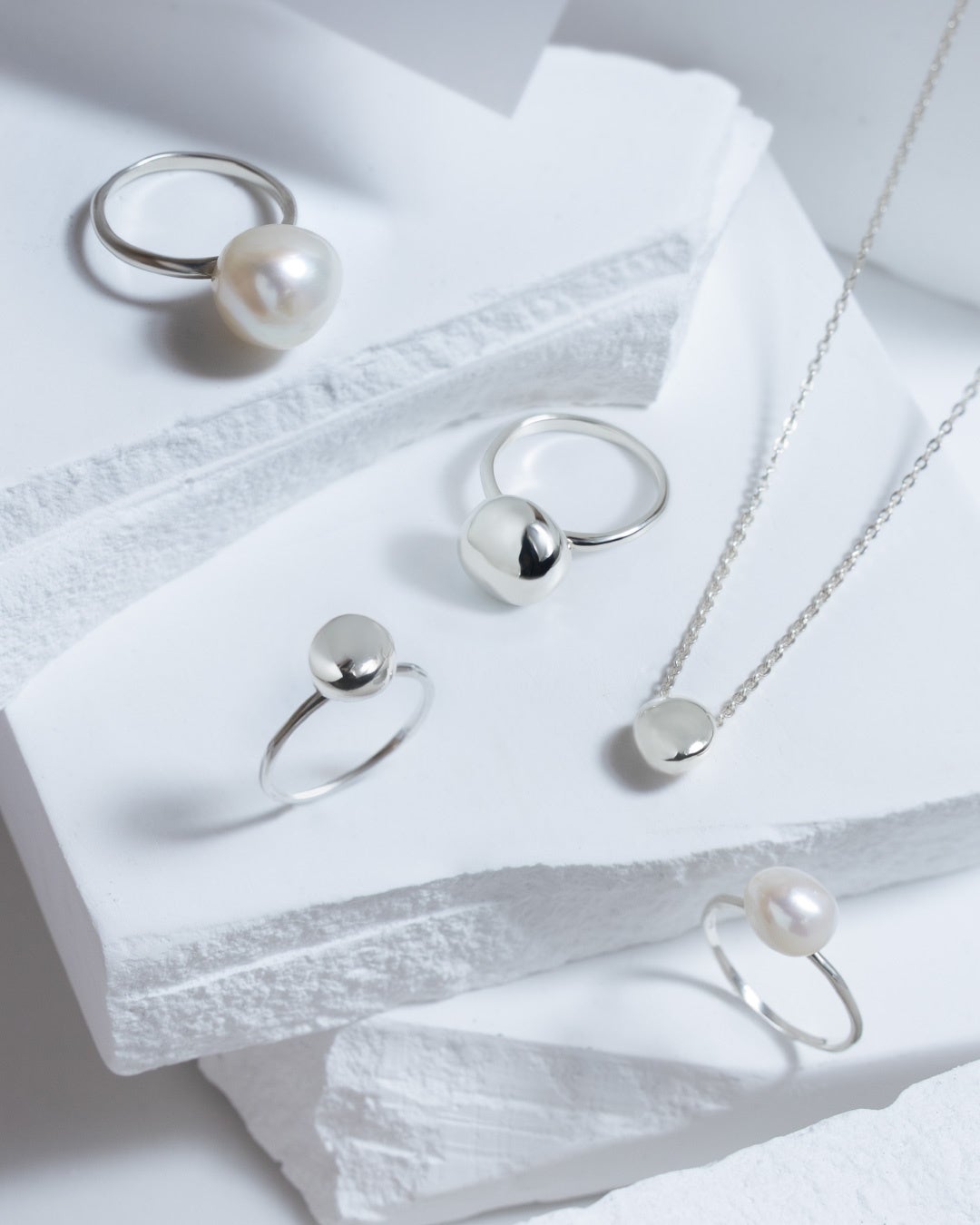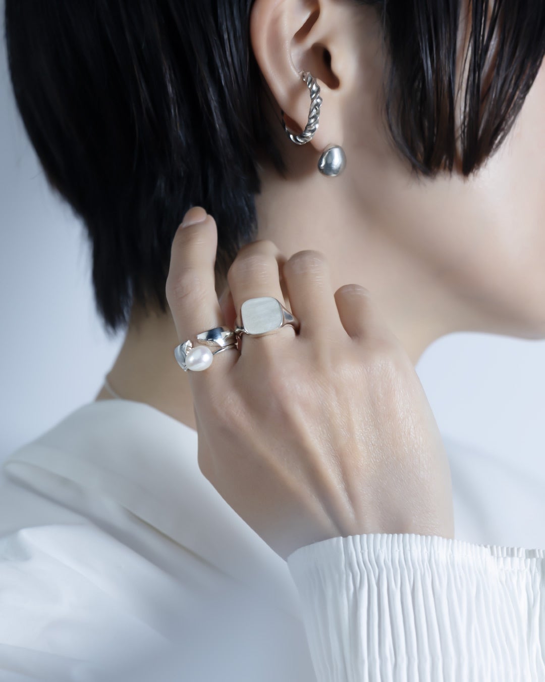 サイズの異なる2種類のバロックパールを用いたリングの他、本物のバロックパールから型を取って制作したシルバーのモチーフはリング2型とネックレス、ピアスで展開。