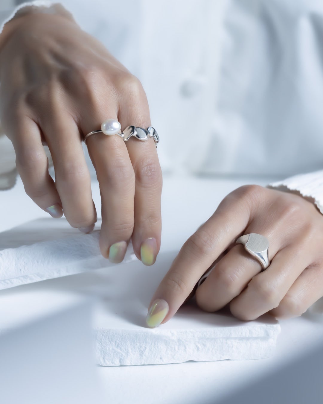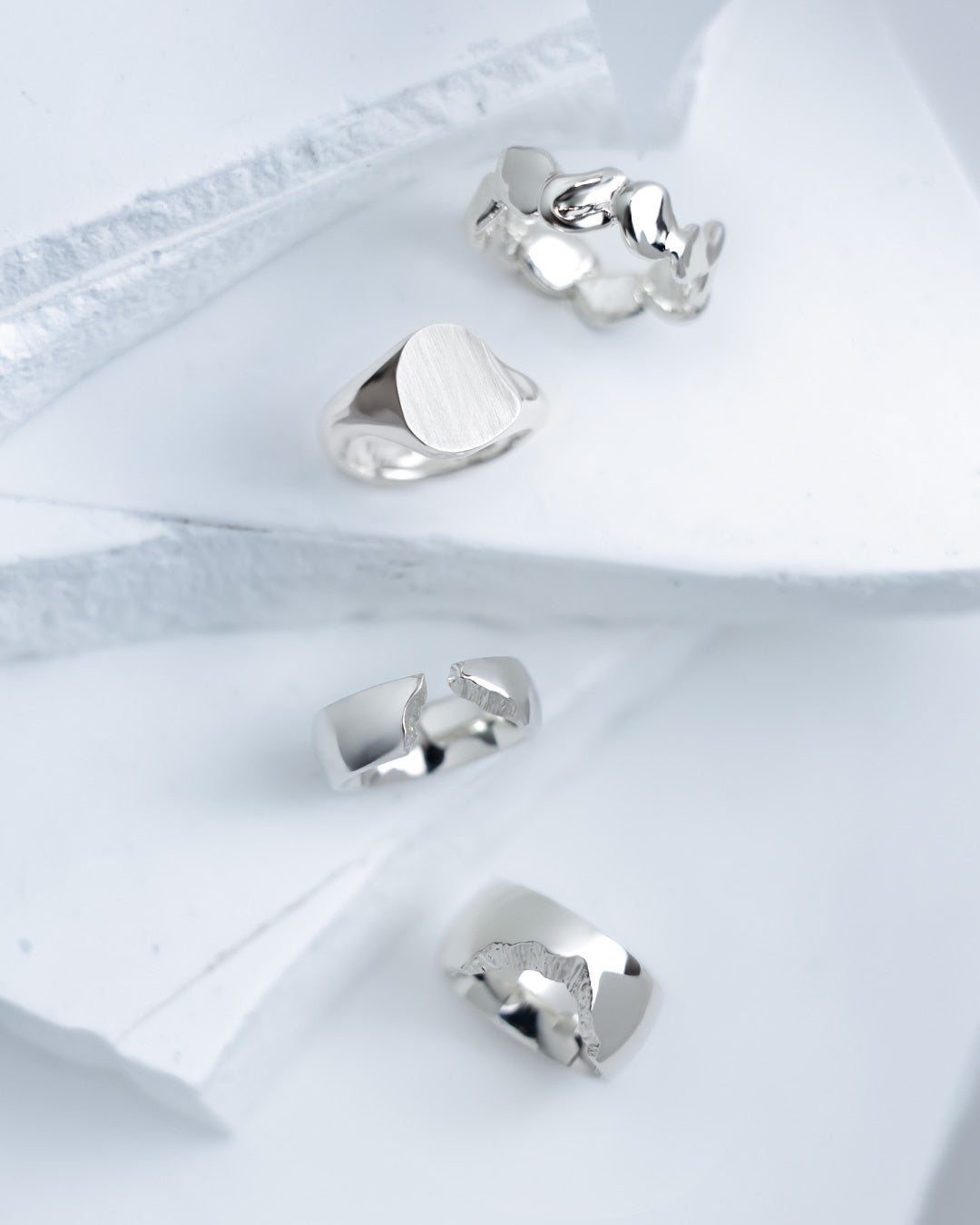 水滴同士が繋がり合う瞬間を切り取ったようなリングや、有機的なフォルムと精巧なフラットな面が共存するユニークな印台リング。