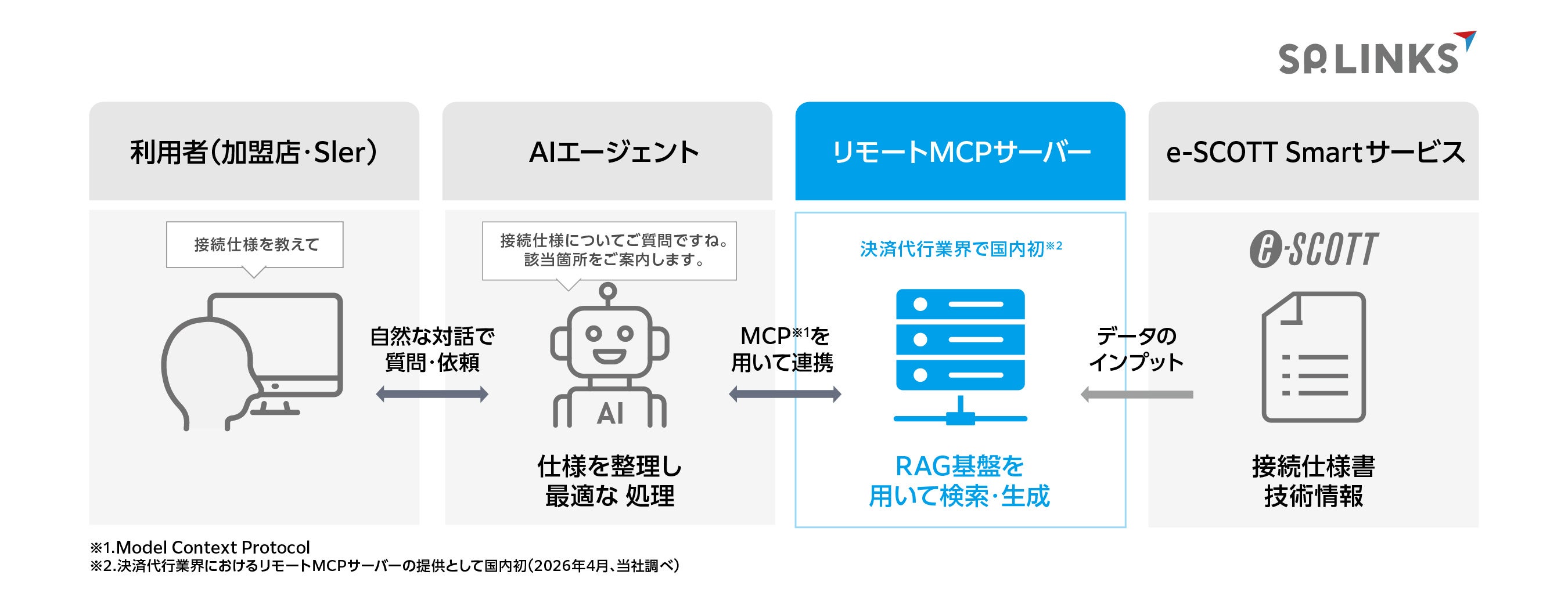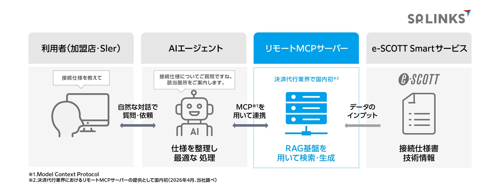 SP.LINKS株式会社(本社:東京都港区、代表取締役社長:野村亮輔 )は、決済代行サービス「e‑SCOTT Smart(イースコット・スマート)」において、AIと業務システムを安全かつ柔軟に連携させる共通仕様「MCP(モデル・コンテキスト・プロトコル、Model Context Protocol)」に対応したリモートMCPサーバーを提供開始します。本機能により、加盟店のシステム担当者や同店をサポートするSIerは、「e-SCOTT Smart」の導入・設定・運用に関する問い合わせや確認を、サービス仕様を理解したAIと自然な対話で行うことが可能となります。SP.LINKSは本取り組みを通じて、「e‑SCOTT Smart」をAI時代にふさわしい、より分かりやすく、直感的に利用できる決済サービスへと進化させていきます。