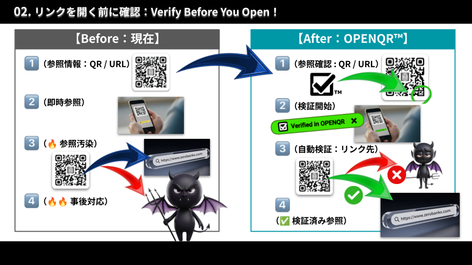 OPENQR™は、既存のQRコードやURLの中身を変更せず、「参照する」という行為の手前に検証レイヤーを追加することで、安全性を確認した上で参照できる仕組みです。