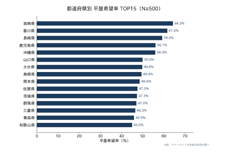 都道府県別に平屋希望率を集計したところ(サンプル数500件以上の県のみ)、宮崎県64.3%、香川県61.6%、長崎県59.2%、鹿児島県56.1%、沖縄県56.0%と西日本・特に九州沖縄エリアで過半数を超えた。一方、東京都は16.5%、大阪府17.9%、京都府20.0%、神奈川県20.9%と三大都市圏では20%前後に留まり、地域による志向の差は最大4倍弱に達している。