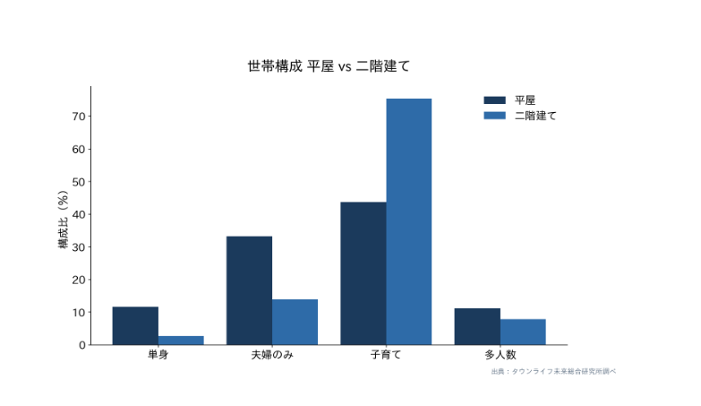 3. 平屋希望者の45.0%が「夫婦のみ・単身」世帯 ─ 子育て世帯中心の二階建てと対照的
