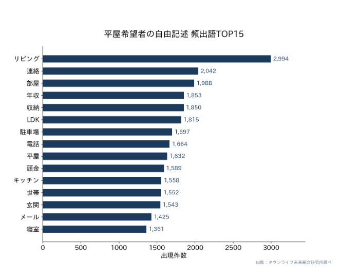 平屋希望者の自由記述欄を形態素解析し、頻出語を抽出したところ、TOP15は「リビング」「連絡」「部屋」「年収」「収納」「LDK」「駐車場」「電話」「平屋」「頭金」「キッチン」「世帯」「玄関」「メール」「寝室」となった(重複文を除外した有効データを対象)。「ロフト」「中庭」「書斎」といった付加価値設備よりも、「リビング」「収納」「駐車場」「寝室」といった基本機能の充実への言及が目立つ。