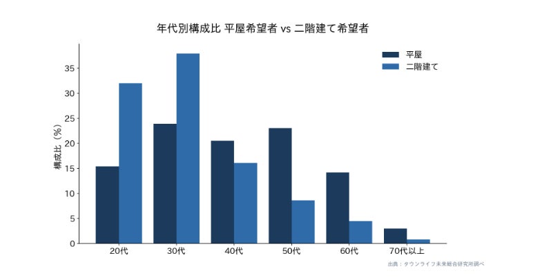 20-30代は子育て・将来の世帯拡大を見据えた二階建て志向が依然優勢である一方、子育てが落ち着いた40代以降では「コンパクト・段差なし・将来の介護動線」への意識が平屋選択の動機として機能していることが推察される。