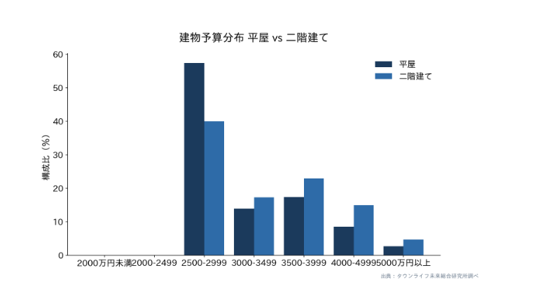 平屋希望者の建物予算分布をみると、2500-2999万円帯が57.4%と過半数を占めた。二階建て希望者の同帯は40.0%であり、平屋検討者は明確に低い予算帯に集中している。