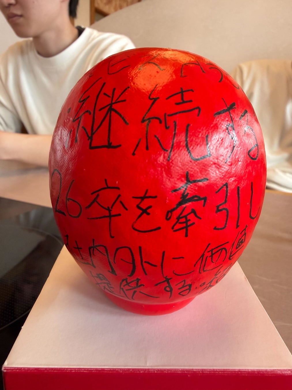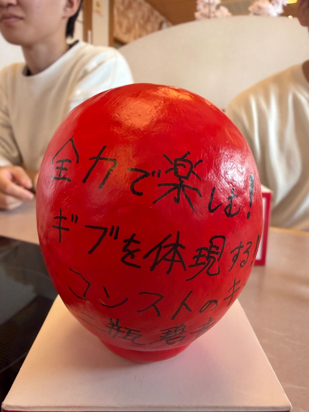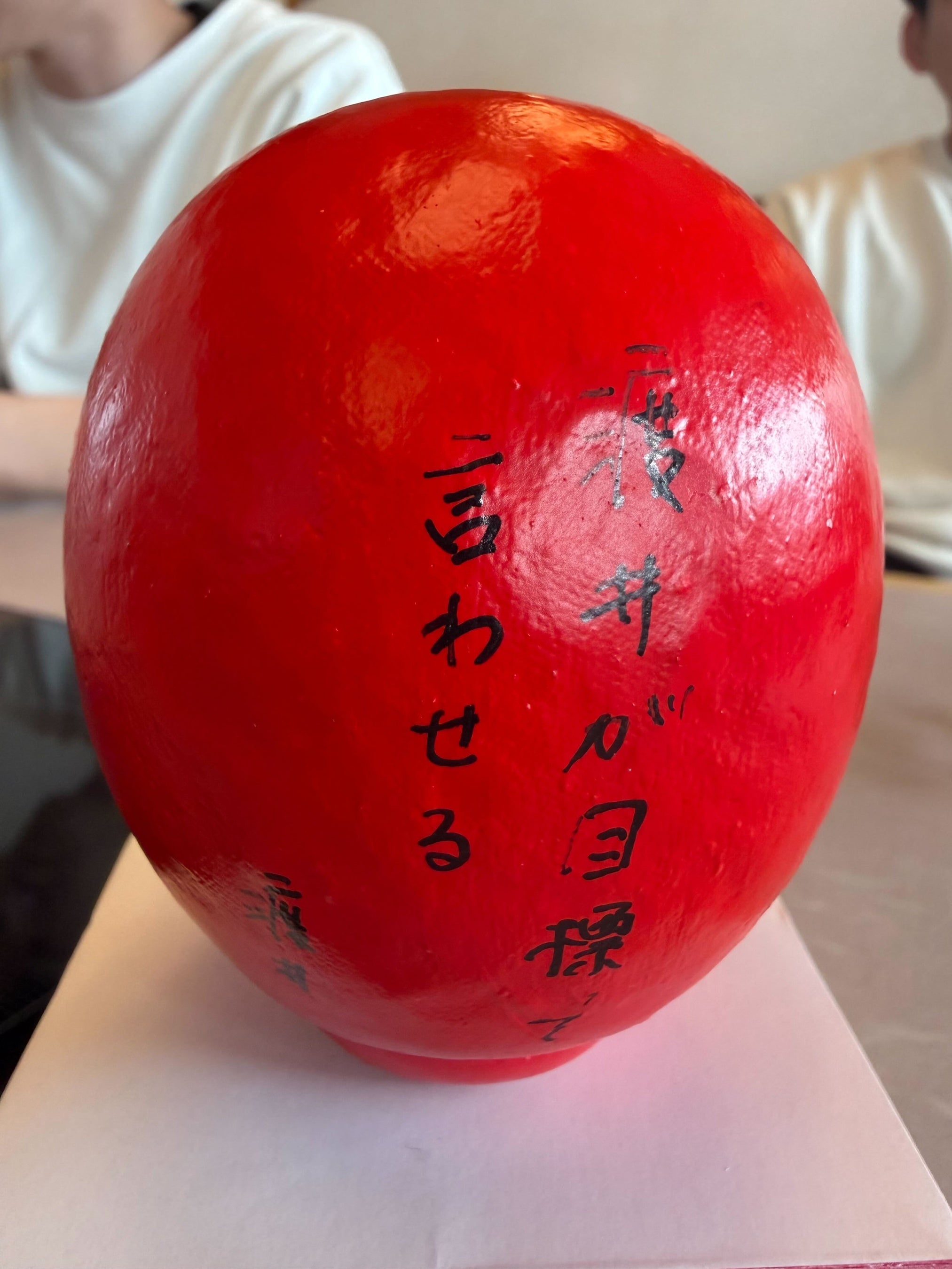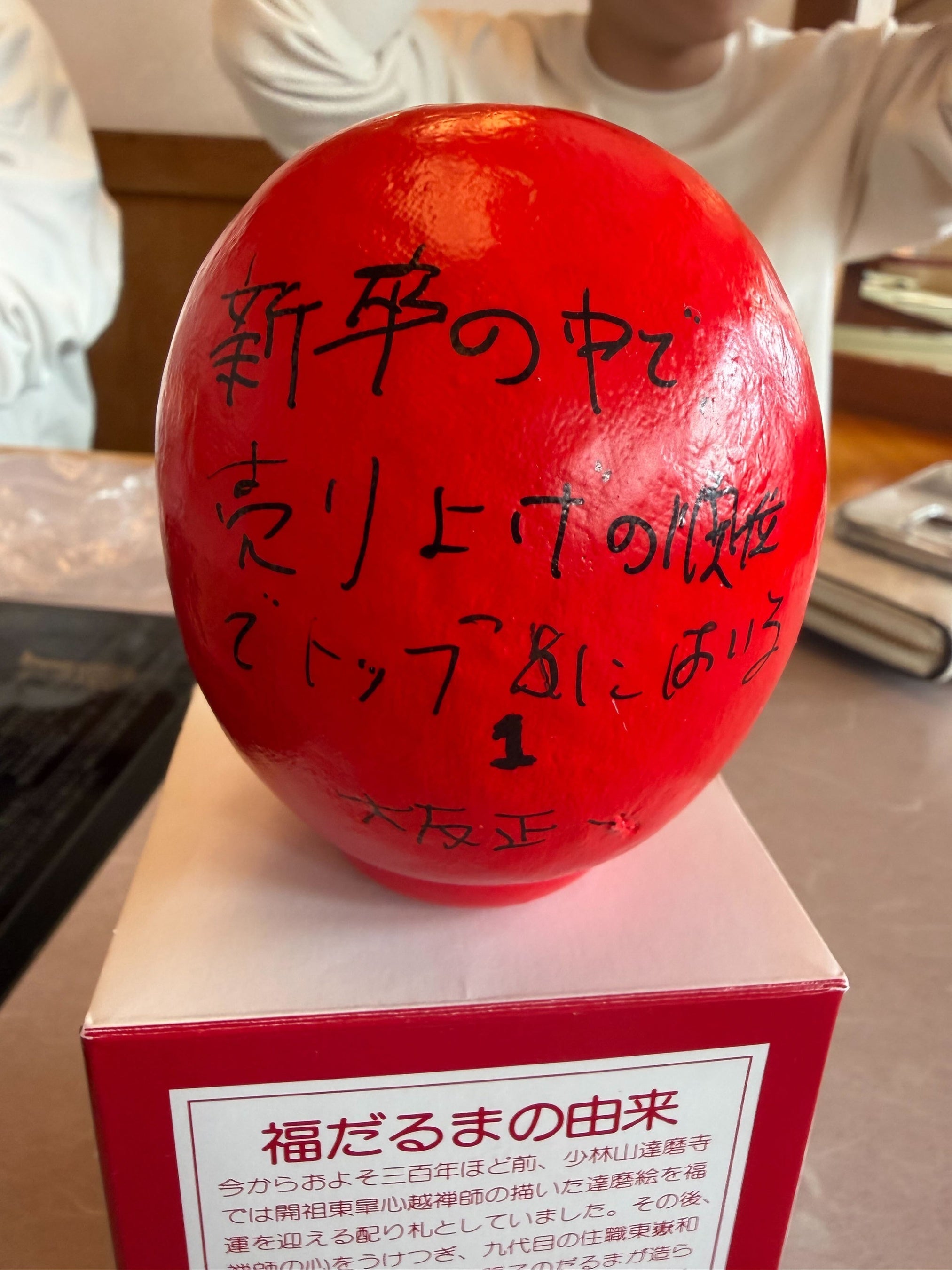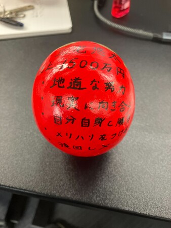 各自が「この1年間で成し遂げること」をだるまに記入。目標達成を自分に約束するため、その場で願いを込めて「左目」を入れました。残る右目は、1年後に目標を達成した際に自分たちの手で入れることを誓っています。