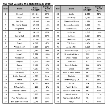 世界的なブランドコンサルティング会社であるインターブランドは昨年に引き続き、“The Most Valuable U.S. Retail Brands 2010”(最も価値のある北米の小売ブランドのランキング)を発表しました。
